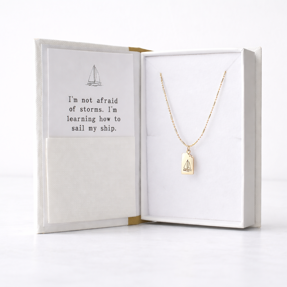 Featuring a tiny book-page charm with a delicate boat symbol, this necklace reflects the strength it takes to keep moving forward, even when the waters feel uncertain. Crafted in tarnish-resistant gold with a slide-adjust chain up to 20 inches, it’s easy to wear at your perfect length—layered or worn on its own.